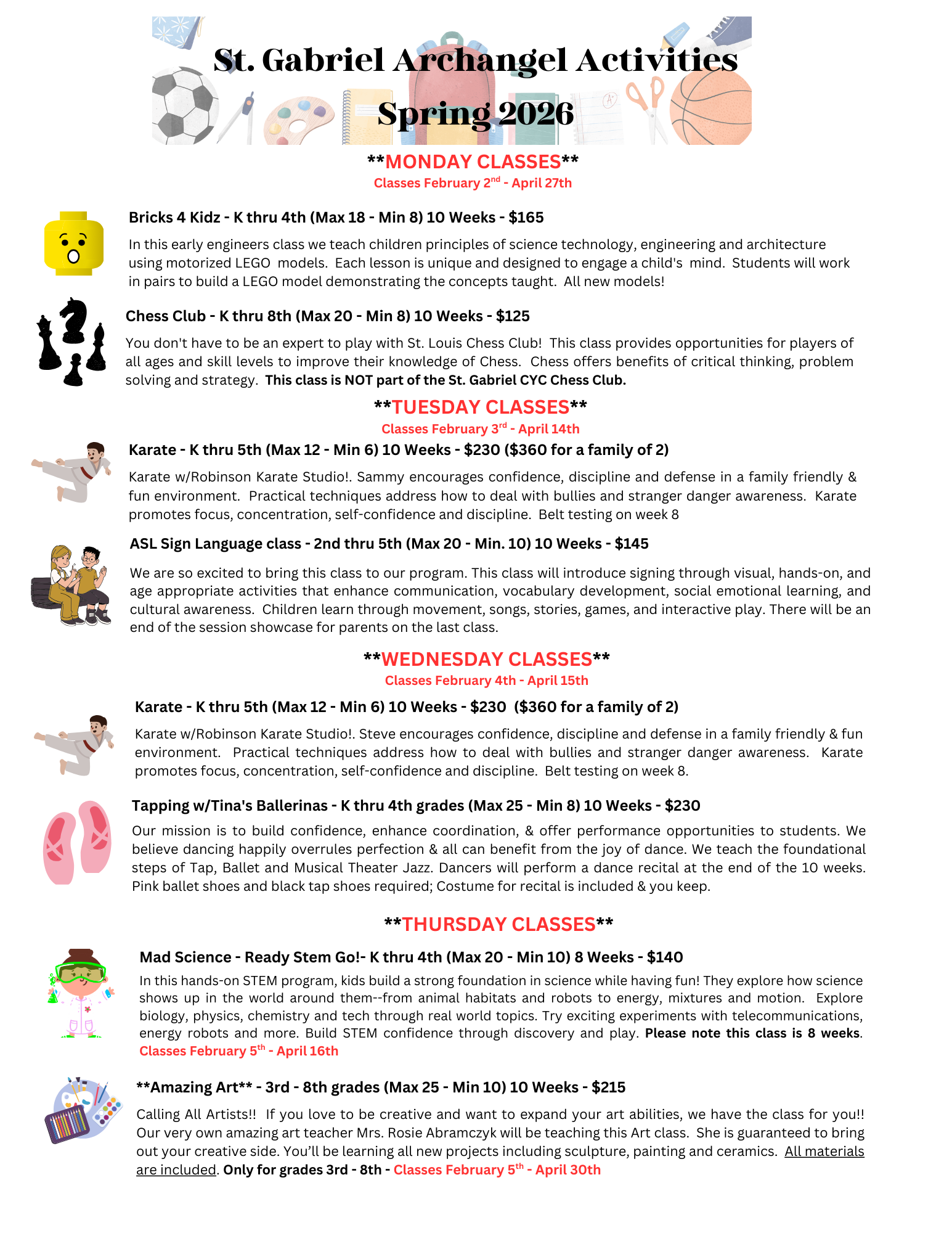 Please mark your calendars for Friday, January 2nd at 10 am when sign ups will go live. There will be a link posted to the school website under Archangel Activities at 10 am. Sign ups will be open from January 2nd to the 9th. Once signups close you will receive an email with a google link with information that MUST be filled out within three days. Once the google form is filled out, you will receive a charge for the class or classes you signed up for on your FACTS account. Payments must be made prior to the start of the first class.